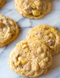 Instructions Preheat the oven to 325 degrees F. Line baking sheets with parchment paper and set aside. Place a large skillet on the stovetop over medium heat. Add the bacon pieces into the skillet and separate with a wooden spoon. Cook the bacon until red and crispy, then turn off the heat. Remove the bacon from the grease with a slotted spoon, but do not drain on a paper towel. (A little grease will keep the bacon bits moist.) Place the softened butter and both sugars in the bowl of an electric mixer. Beat on high to the butter and sugar until light and fluffy, 3-5 minutes. Scrape the bowl, then turn the mixer on low and beat in the eggs, vanilla, baking soda, and salt. Slowly add in the flour until just combined. The dough should look a little stiff. (It softens when you add the bananas.) Add the cooled bacon and peanut butter morsels to the dough. It's ok if a little bacon grease drips into the dough. Beat until the bacon and peanut butter morsels are evenly distributed. Then gently mix in the bananas, trying not to smash all the pieces. Do not over-mix. Using a 1.5 tablespoon cookie scoop, portion the cookies evenly and place them on the cookie sheets, two inches apart. Bake for 12-15 minutes, taking them out of the oven when the edges look golden, but the centers still looks slightly underbaked. Cool on the cookie sheets for at least 5 minutes before moving.